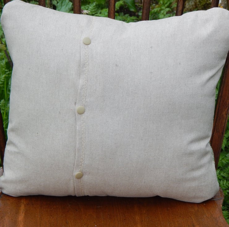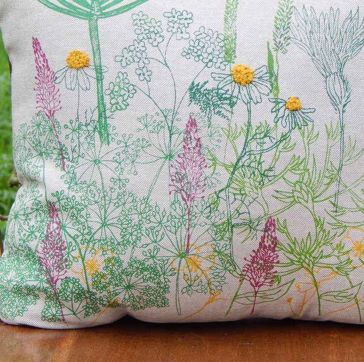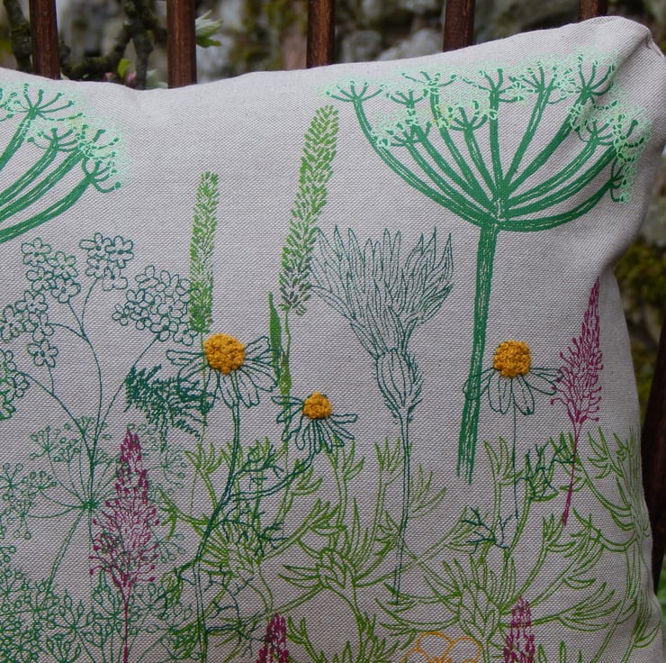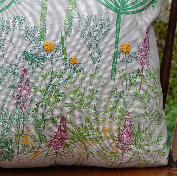 This is a beige medium weight cotton cushion that has been screen printed with my own designs. Many have been individually printed which involves positioning, printing an individual flower, drying and then repeating. This gives you an absolutely one off, designed cushion. The wild chamomile has been hand embroidered with french knots on the yellow flower middles. The reverse of the cushion is beige to match the front. The cushion is an envelope style with 3 poppers to stop any gaping.