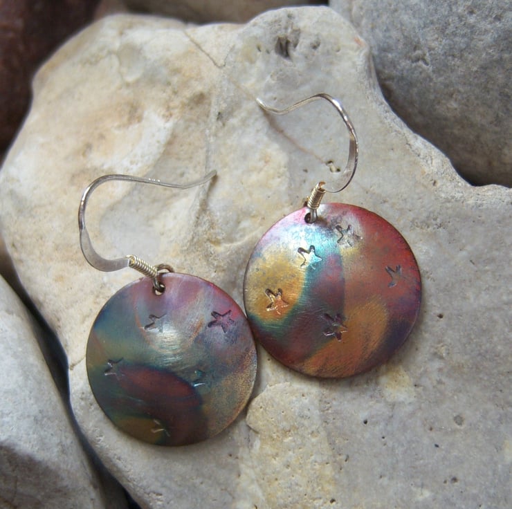 These round copper earrings are approximately 2 cms across and are slightly domed. They have been randomly imprinted with stars. Sterling silver ear wires.