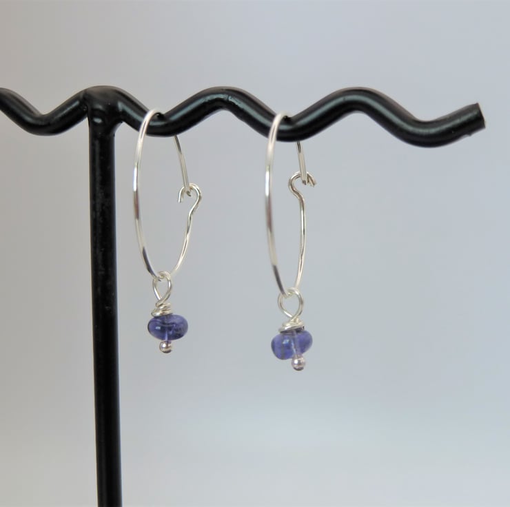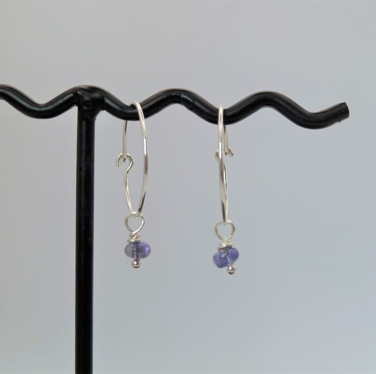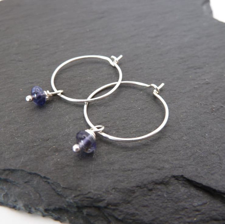 A pair of sterling silver hoop earrings which feature Grade AA Iolite gemstone beads.