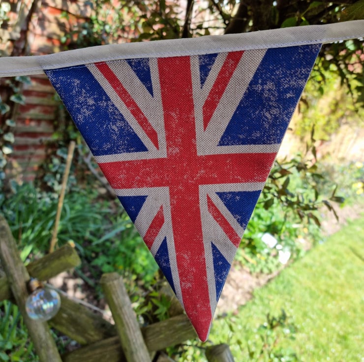 Large cotton, double sided bunting in a vintage style union jack print with cream bias binding.