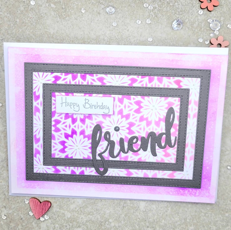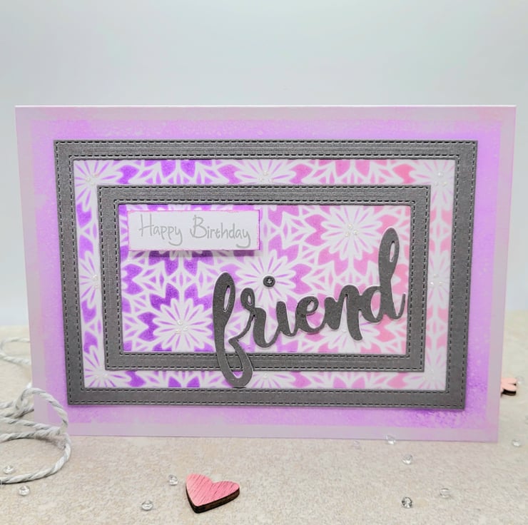 The card measures 12.5 x 17.5 cm approx., and features a contemporary floral design in soft yet vibrant purple and lilac and pink tones. There is a bold contrasting border made from grey card and a "FRIEND" sentiment in a scripty font. A small white banner with HAPPY BIRTHDAY in grey ink is also on the front.