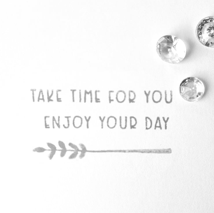 The card base has a distressed inked border and there are tiny non-shedding glitter glue accents. Inside reads "TAKE TIME FOR YOU" and "ENJOY YOUR DAY" stamped in grey.