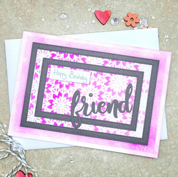 An individually handmade, layered birthday card for a friend. Comes with a matching pattern stencilled on the white envelope. Designed and stencilled by hand in my craftroom, using a variety of non-toxic quality archival inks.