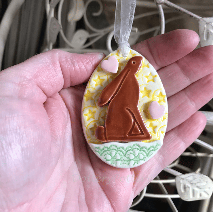 This little ceramic easter egg is made from white earthenware clay and topped with a moongazing hare. This has been fired in an electric pottery kiln, so it is nice and strong. It measures 6.5cm x 4.5cm and hangs from a matching white organza ribbon. It is glazed on the front and left plain on the back. You will receive the hare egg as shown in first photo with brighter hearts.