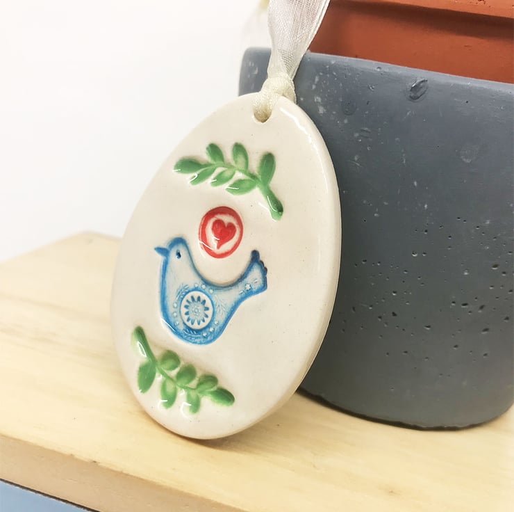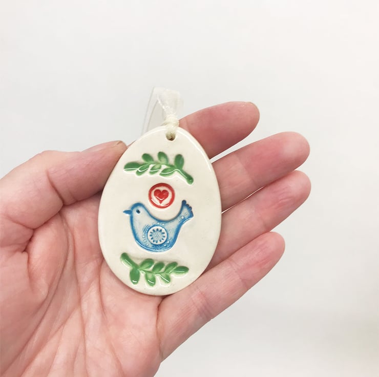 This little ceramic easter egg is made from white earthenware clay and imprinted with pattern.y This has been fired in an electric pottery kiln, so it is nice and strong. It measures 6.5cm x 4.5cm and hangs from a matching cream organza ribbon. It is glazed on the front and left plain on the back.