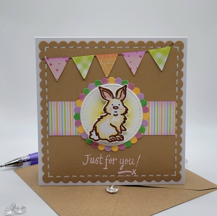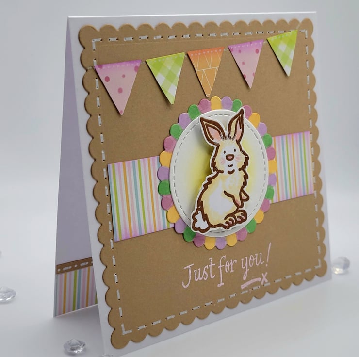 Features include hand cut bunting and the bunny rabbit is heat embossed, cut out and coloured using artist pens. The pink heat embossed sentiment reads 'just for you'. The white card base is handmade from quality recycled card and inside has a matching striped paper trim.