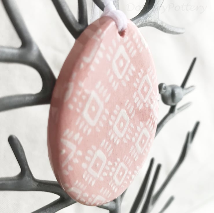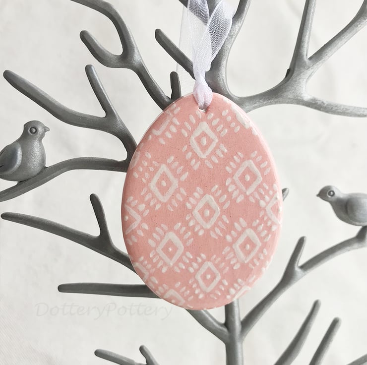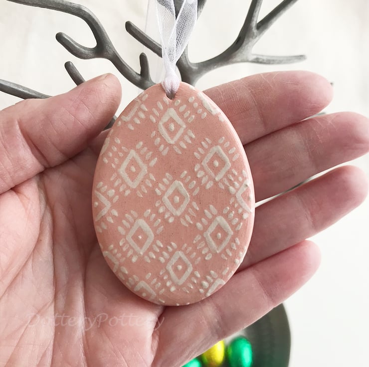 This little ceramic easter egg is made from white earthenware clay and decorated with pattern This has been fired in an electric pottery kiln, so it is nice and strong. It measures 6.5cm x 4.5cm and hangs from a matching white organza ribbon. It is glazed on the front and left plain on the back.