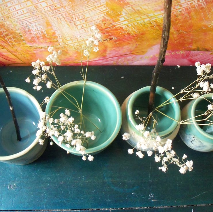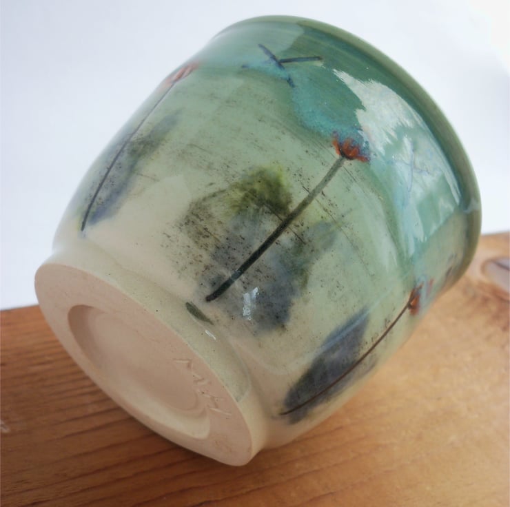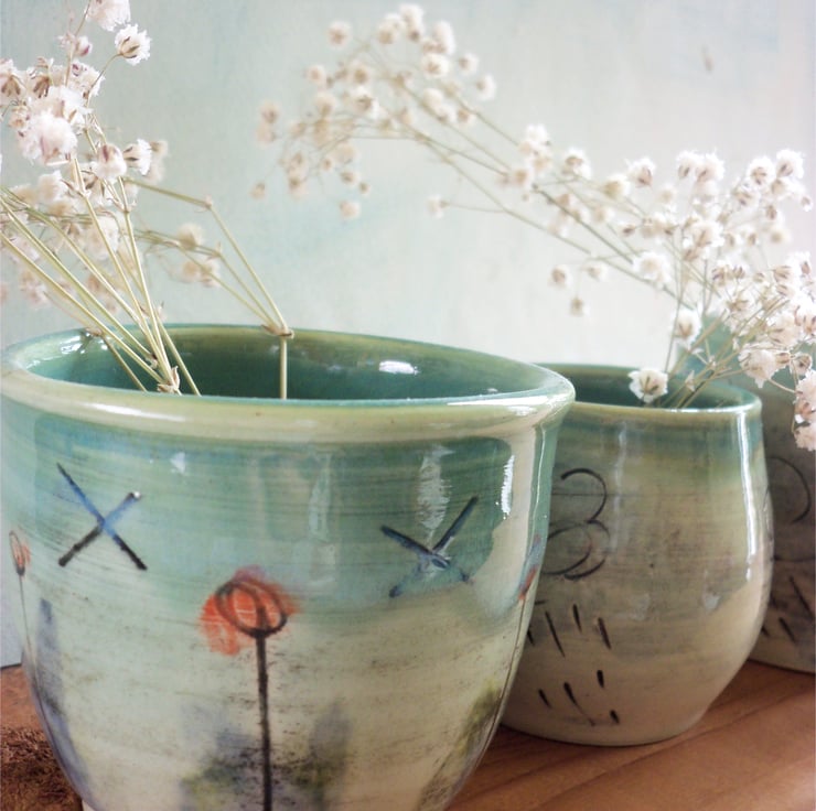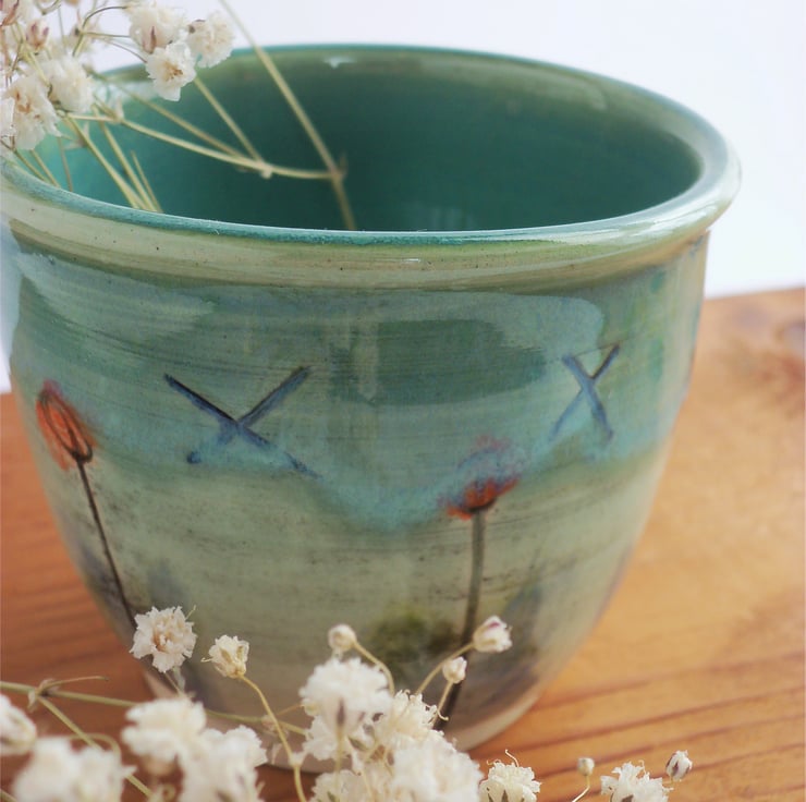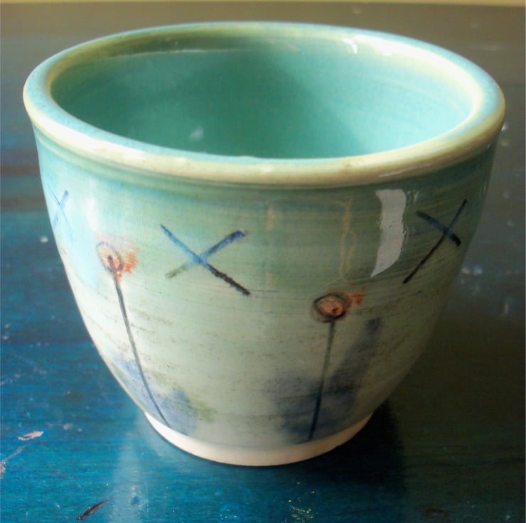 Hand thrown on the wheel using white earthenware clay. My design is etched on the outside and inside the pot is a blue/green glaze.