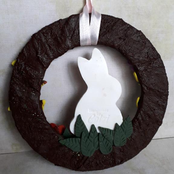 This Easter rabbit floral wreath is 15.5cm diameter, the base is modroc over mdf, which I have painted brown then added the polymer clay decorations on top.