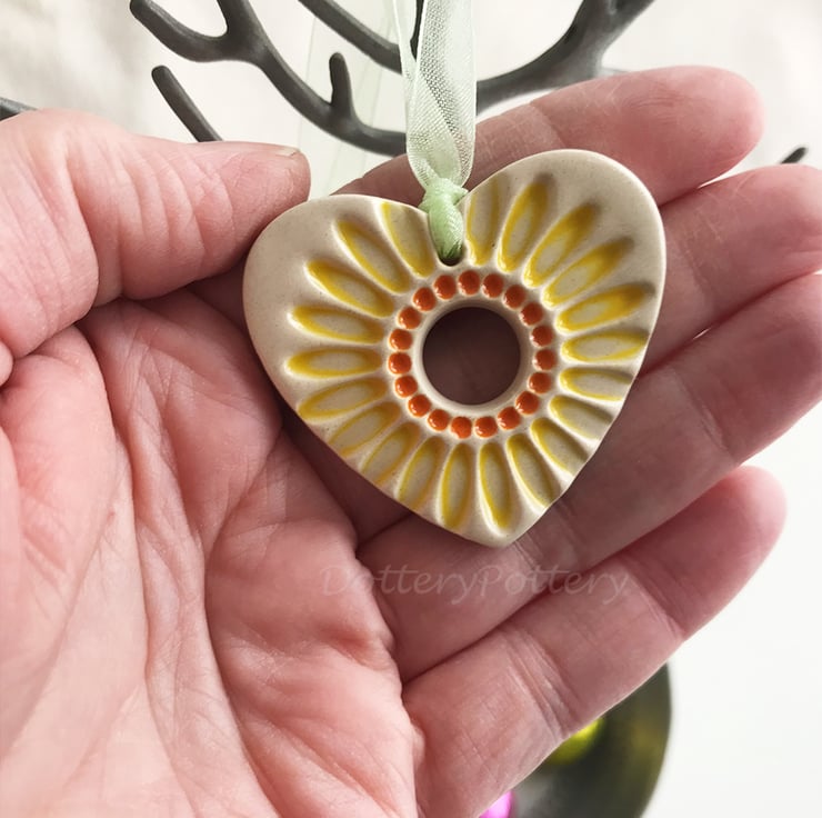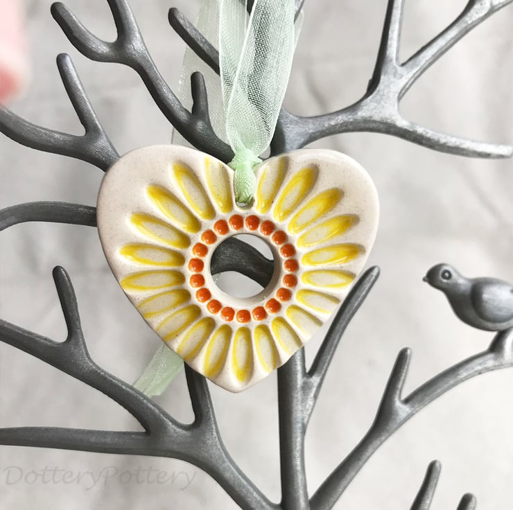 This little heart is made from white earthenware clay and imprinted with a sunflower design. It has been fired twice, once to the bisque stage and then a second firing for the clear glaze. It measures 4.5 centimetres wide x 4.5cm height x 5mm thick.