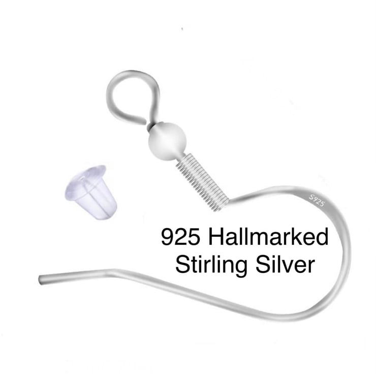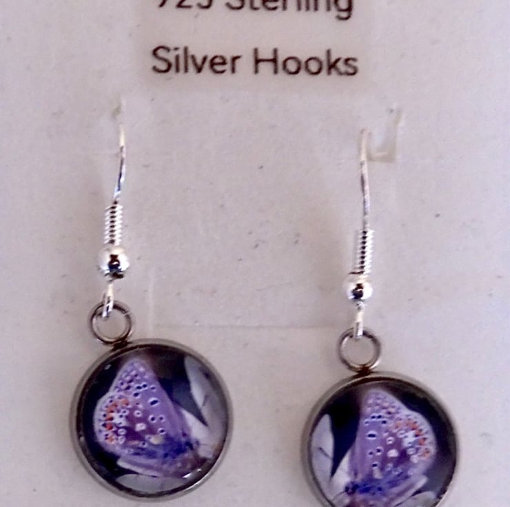 Earrings are 12mm in diameter round and are placed in a silver coloured bezel with a glass cabochon. All drop earrings are mounted on Hallmarked 925 Sterling Silver Hooks.