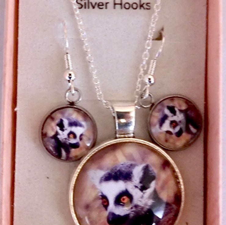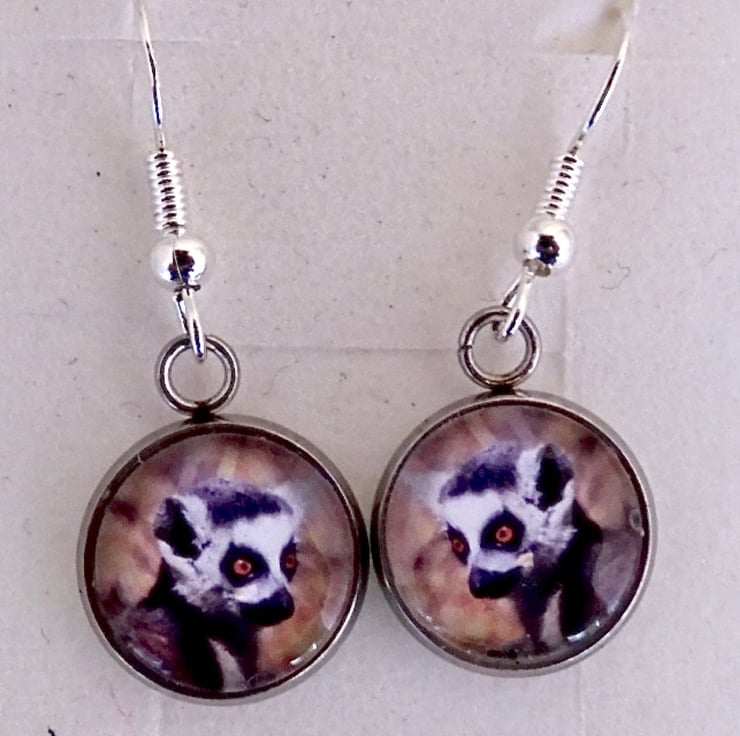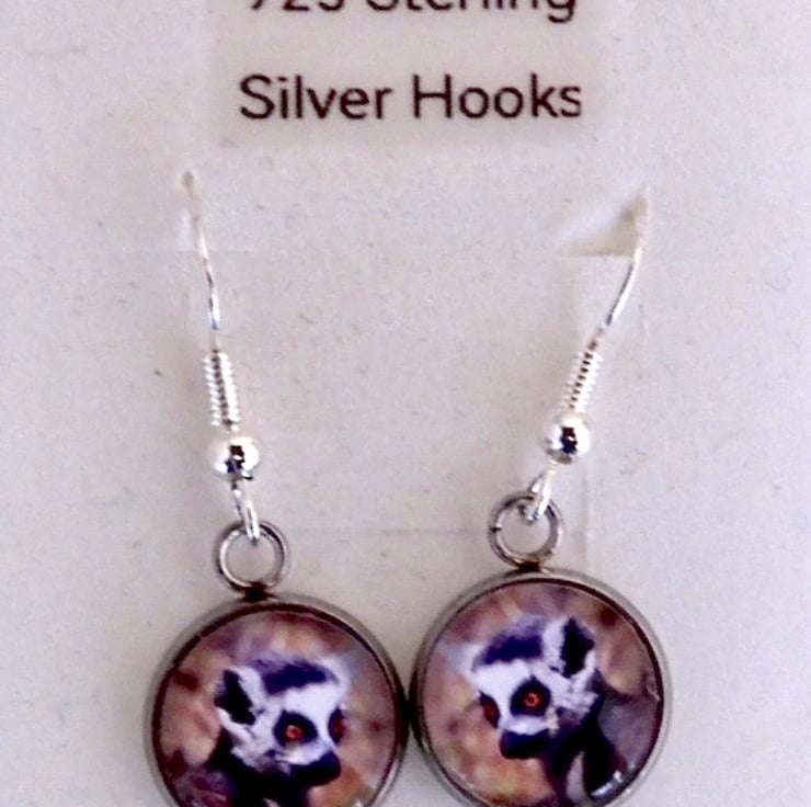Here we have a pair of dangle earrings with 925 Stirling silver hooks depicting a beautiful original photograph of a Ring Tailed Lemur. They come in a pretty presentation box and are ideal for gift giving or as a nice treat for yourself.