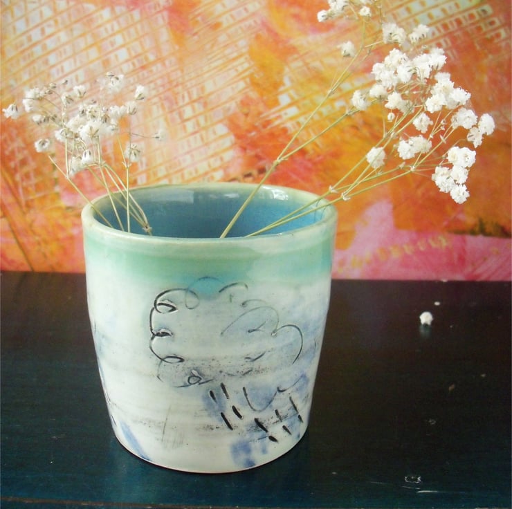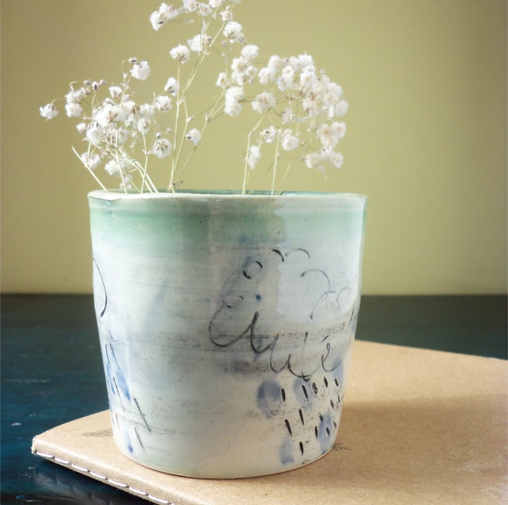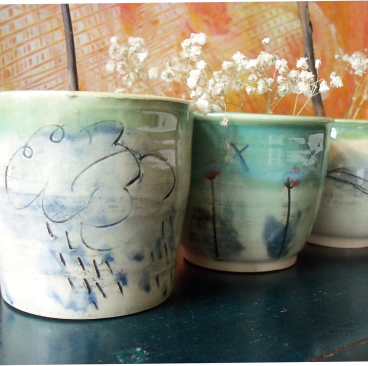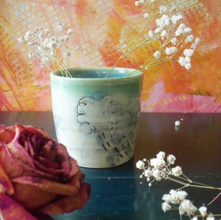 Inside is a light blue glaze and on the outside is my cloud and rain design. The rim of the pot is not a perfect circle - adds to it's character of course!