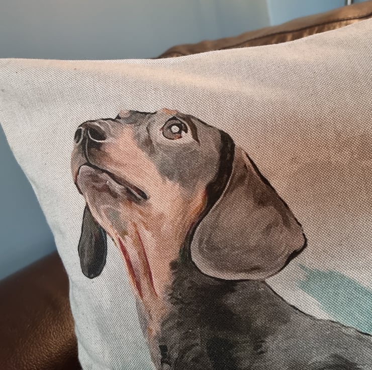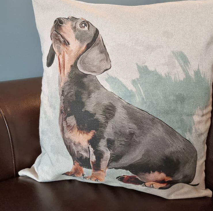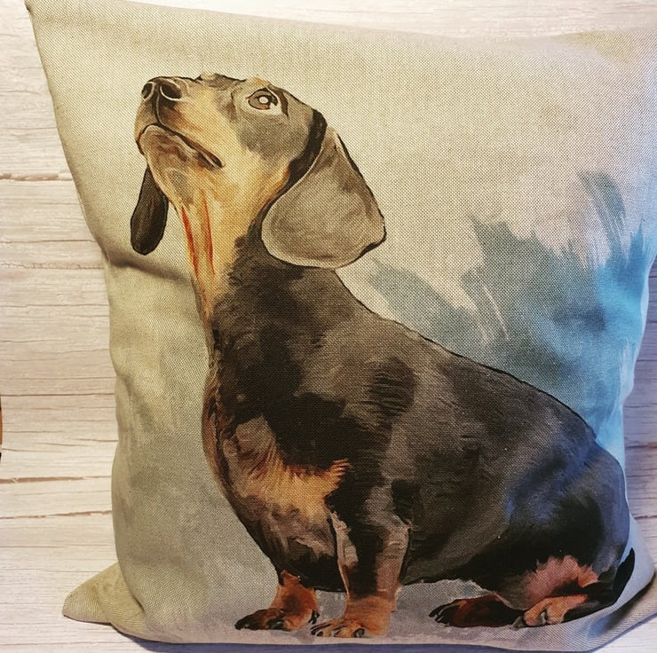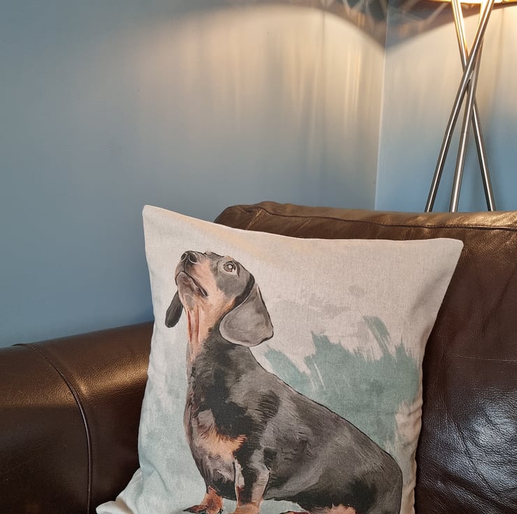 Pretty cushion cover featuring an adorable inquisitive dachshund.