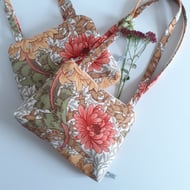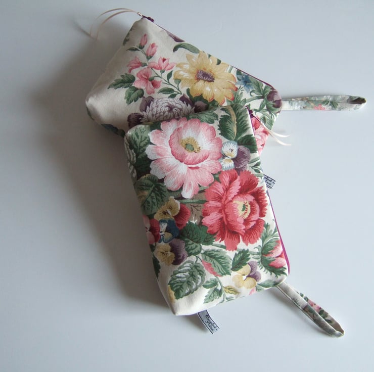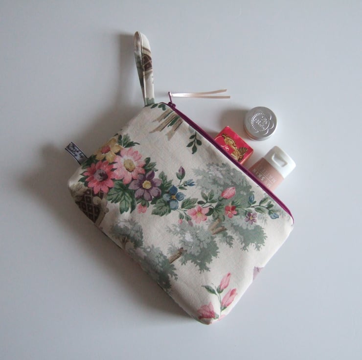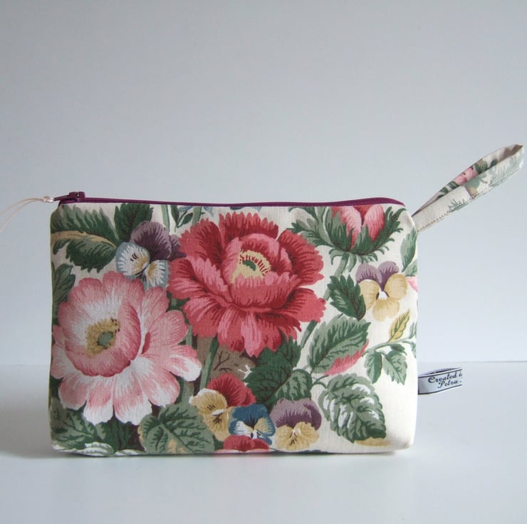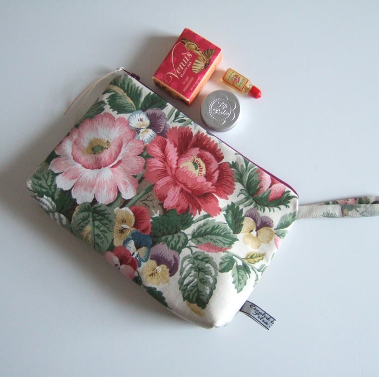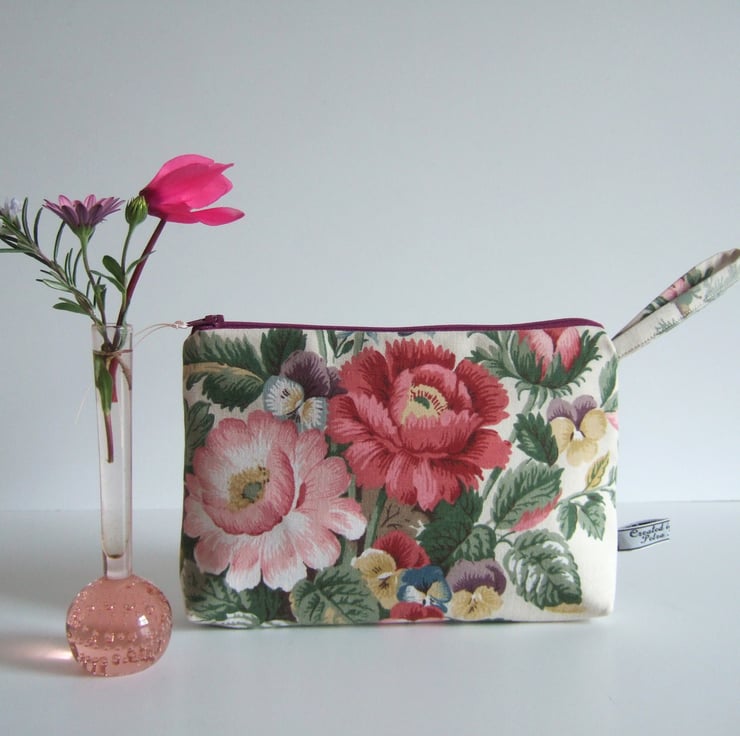 This cute bag is an end of a summer line, and is in perfect condition, it is only in my sale items to clear space for new arrivals. This practical little make up bag would double up as a handbag organiser, or to carry small amounts of toiletries for a weekend away. Made from a classic vintage floral print from Sanderson, its wonderful pastel blooms have a gently faded feel. It would make a lovely present for a someone who loves flowers or vintage, or as a going away to Uni present.