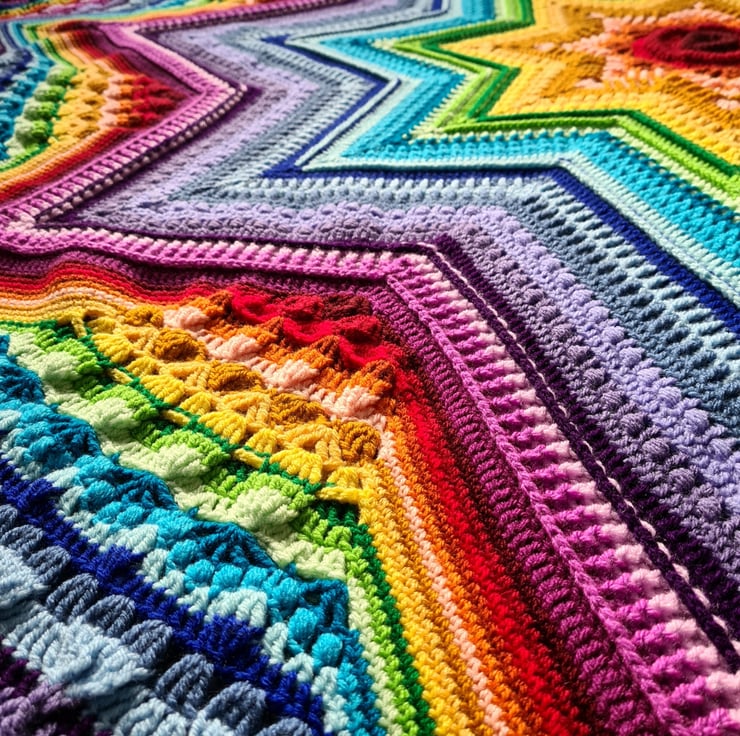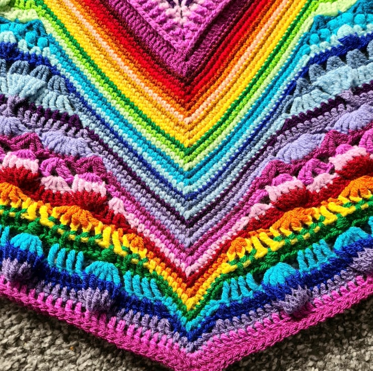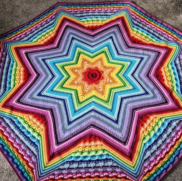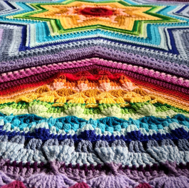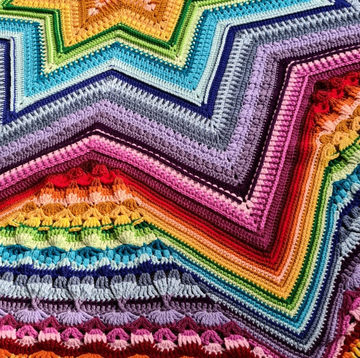 Well what can be said about this absolutely stunning rainbow blanket! This was made using the pattern "Star of Wonder" designed by Helen Shrimpton. Not only are the colours so vibrant and cheerful but the texture is amazing too.