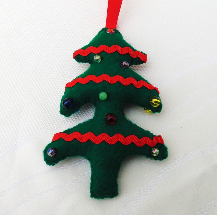 The Xmas tree is decorated with a selection of beads and embellished with red ric-rac.