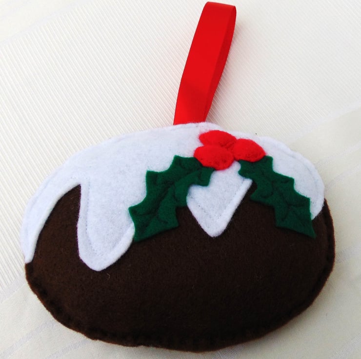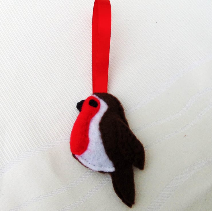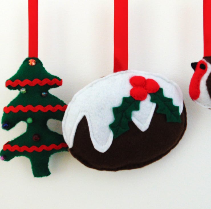 All handcut from felt, they hang from a red ribbon, securely sewn to each item. They are stuffed with hollow fibre filling.