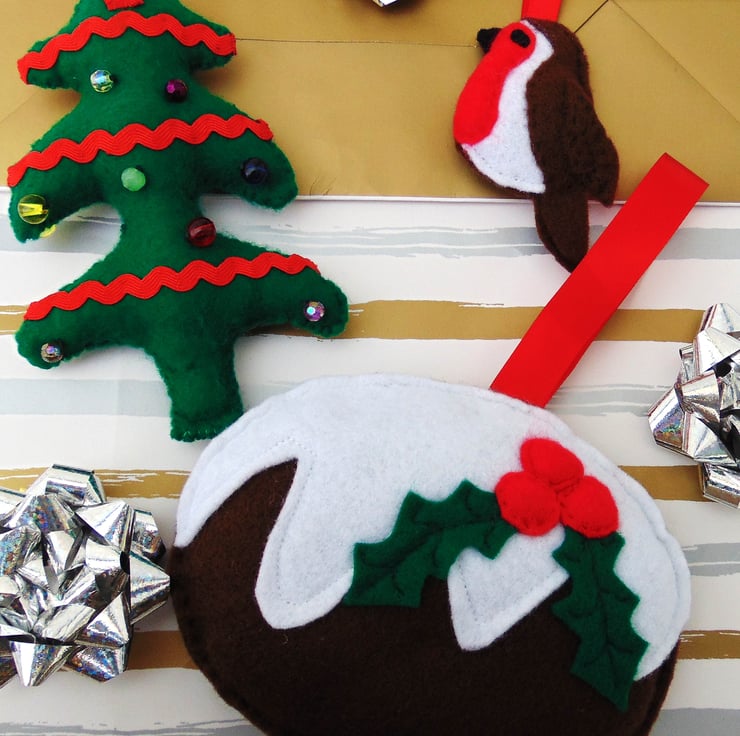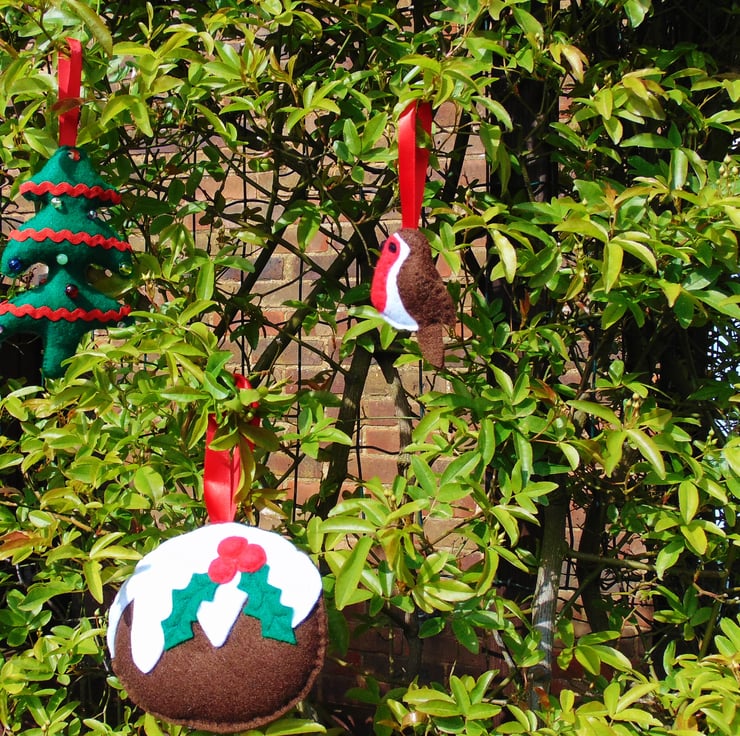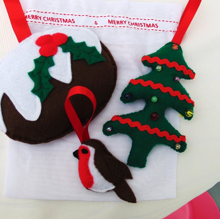 This trio of handmade felt decorations comes in a presentation bag. They would make a lovely gift idea, or the bag is a safe place to store them each year if they are for yourself.
