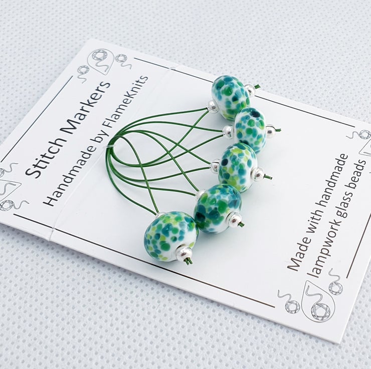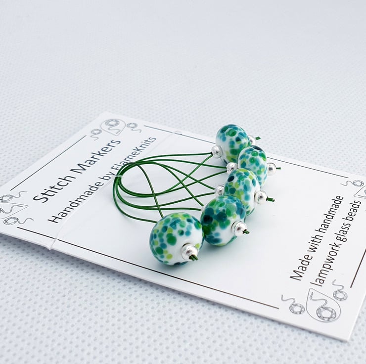 Made with funky coloured tigertail wire, the beads are securely crimped in place and finished with crimp covers. They will fit a range of knitting needle sizes. Please see my other listings for examples shown on a 4mm bamboo needle for size reference. Each stitch marker is approximately 3.5cm from top to bottom. Want these colours on a tigertail stitch marker instead? Find them here: https://folksy.com/items/7941444-Lampwork-Stitch-Markers-Emerald-Speckles