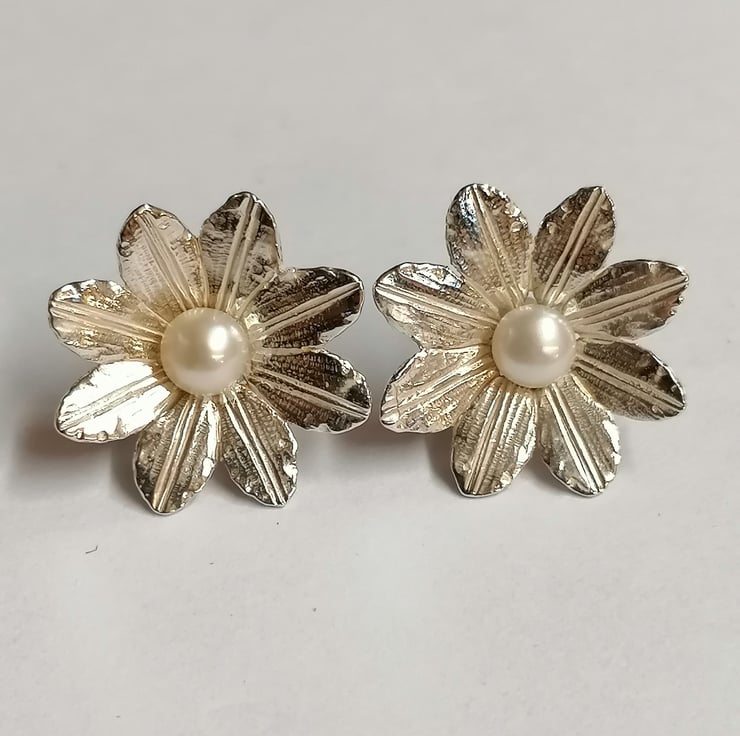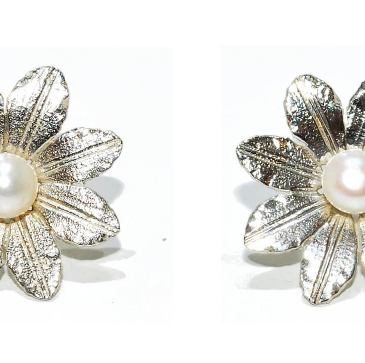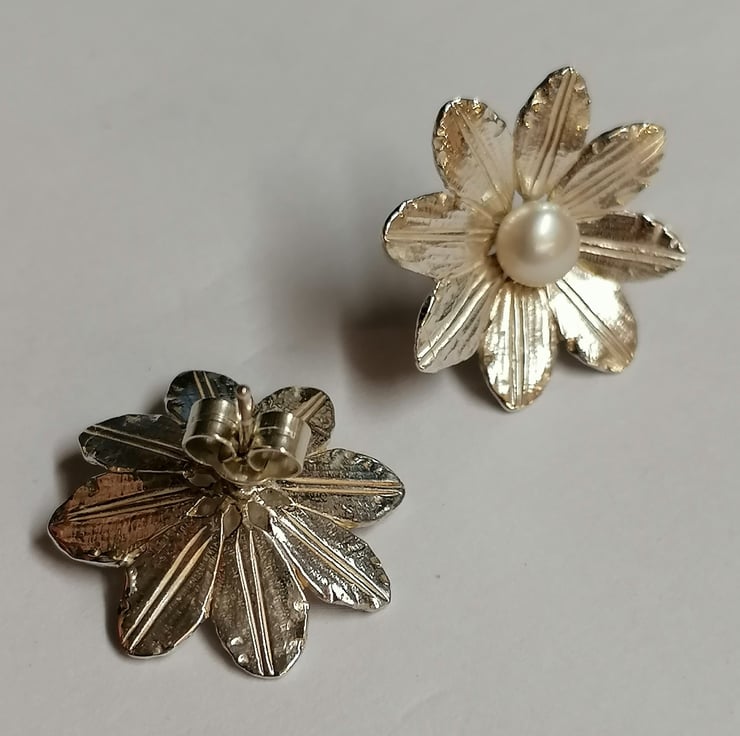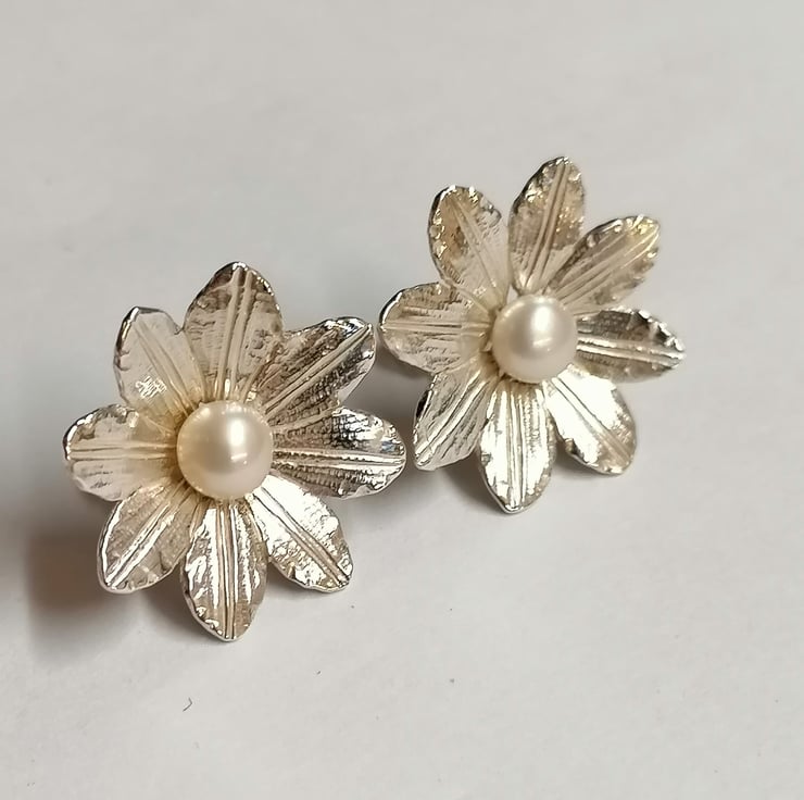 Clematis ear studs hand made from Silver set with a Freshwater Pearl