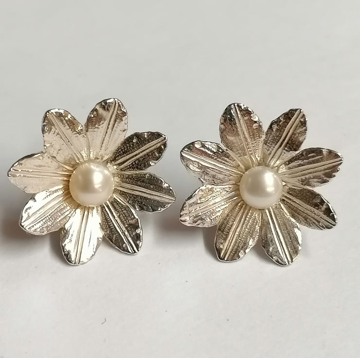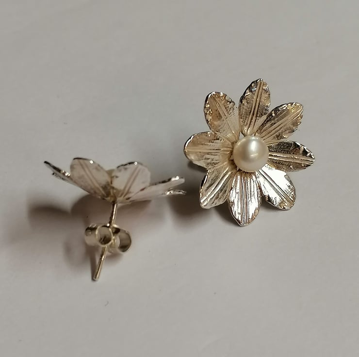 Clematis earstuds hand made from Silver set with a 5 mm Freshwater Pearl
