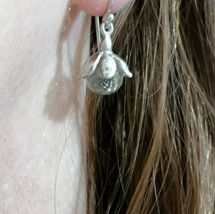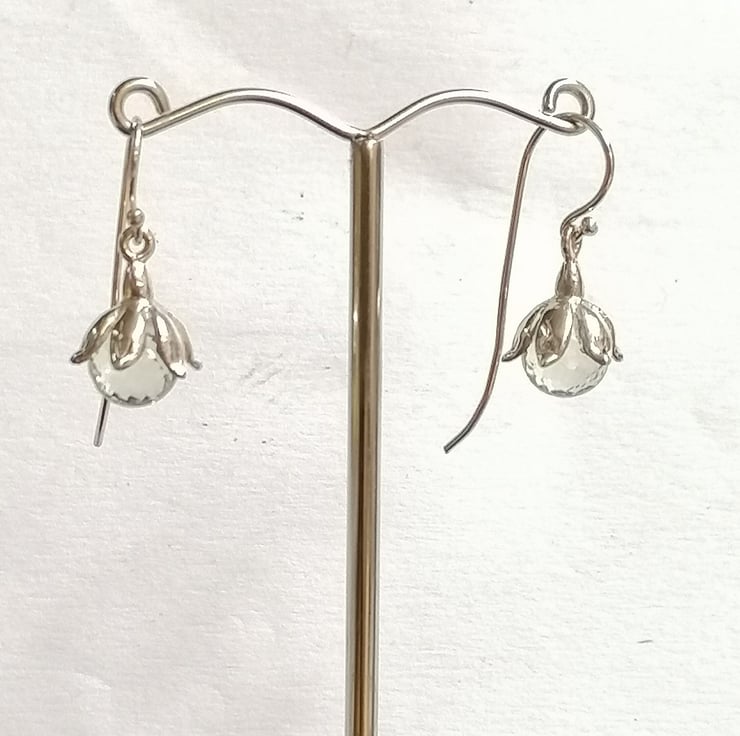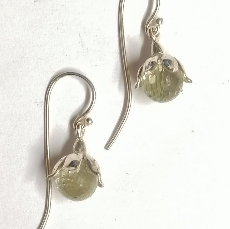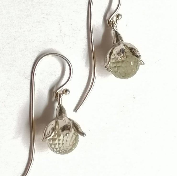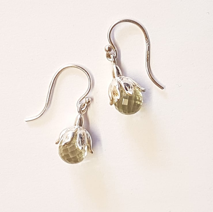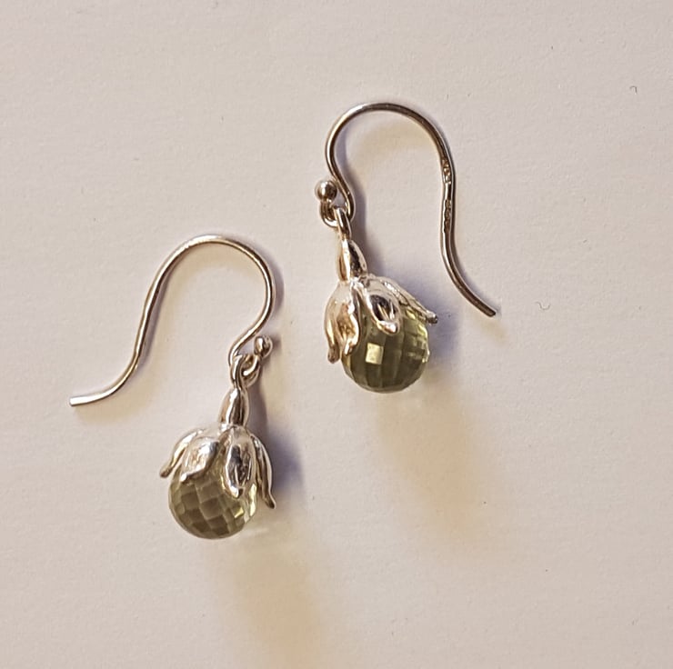 Leucojum Green Quartz faceted drops hand made from silver. Hallmarked at the London assay office