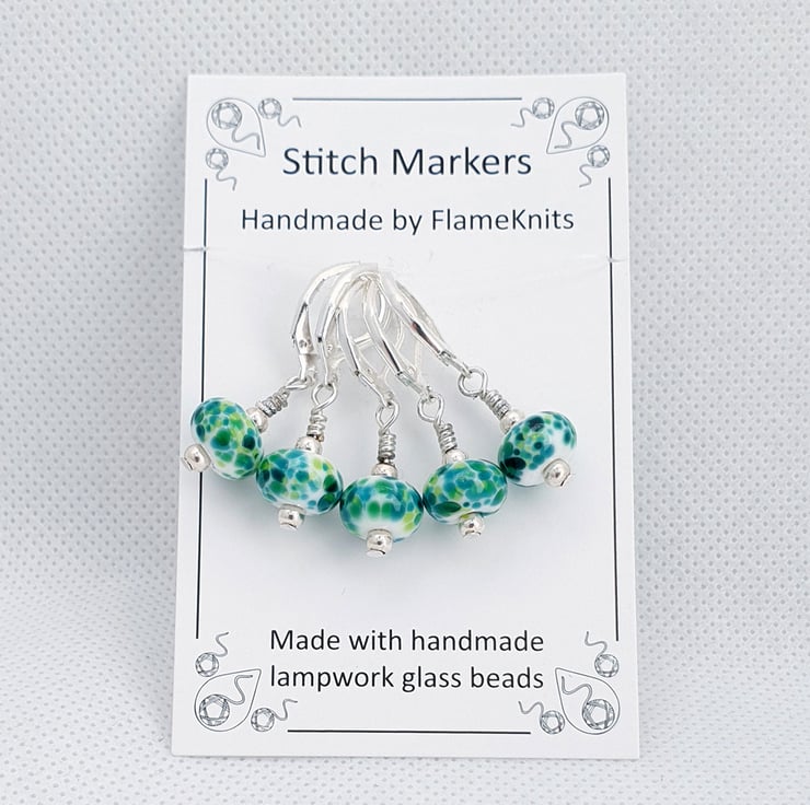 Made with repositionable findings, they will fit a range of knitting needle sizes. Please see my other listings for examples shown on a 3.25mm rod for size reference. Each stitch marker is approximately 3.5cm from top to bottom. Want these colours on a tigertail stitch marker instead? Find them here: https://folksy.com/items/7941190-Lampwork-Stitch-Markers-Emerald-Speckles