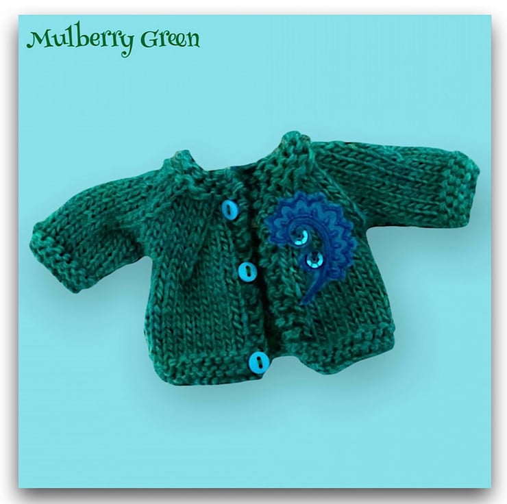 A lovely soft cardigan in teal shaded wool to match the peacock feather print dresses, to fit the Mulberry Green characters. The cardigan is embroidered and sequinned with a stylised peacock feather.