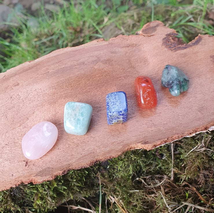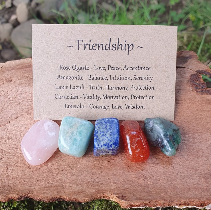A set of 5 tumblestones chosen to help make and maintain friendships - Rose Quartz, Amazonite, Lapis Lazuli, Carnelian, and Emerald. Presented in a velvet pouch with information card.