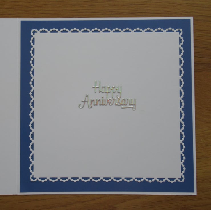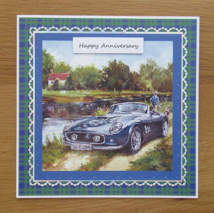 This lovely card features the image of a coupe sports car in the countryside and it sits upon a blue and green checked background. A fancy edged die has been used to frame the image and the inside of the card is finished to coordinate with a simple die cut Happy Anniversary greeting.