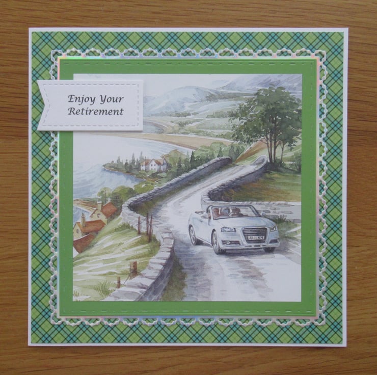 This lovely card features the image of a white open top car being driven along the coast, and it sits upon a green and blue checked background. A fancy edged die has been used to frame the image and the inside of the card is finished to coordinate but has been left blank for your own message.