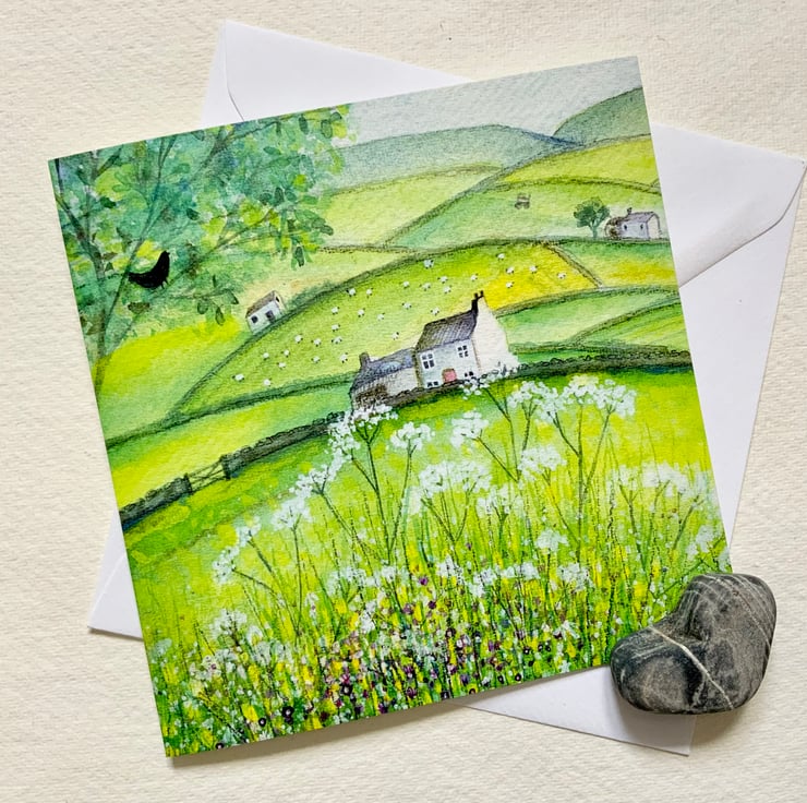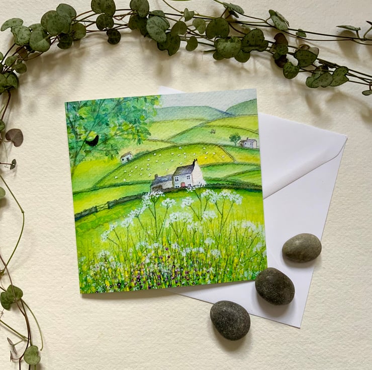 This card has been printed from an original painting that I did, featuring a pretty cottage surrounded by meadows. It is a blank greetings card making it suitable for a variety of occasions. It measures 14.5x14.5 cm and comes with an envelope.