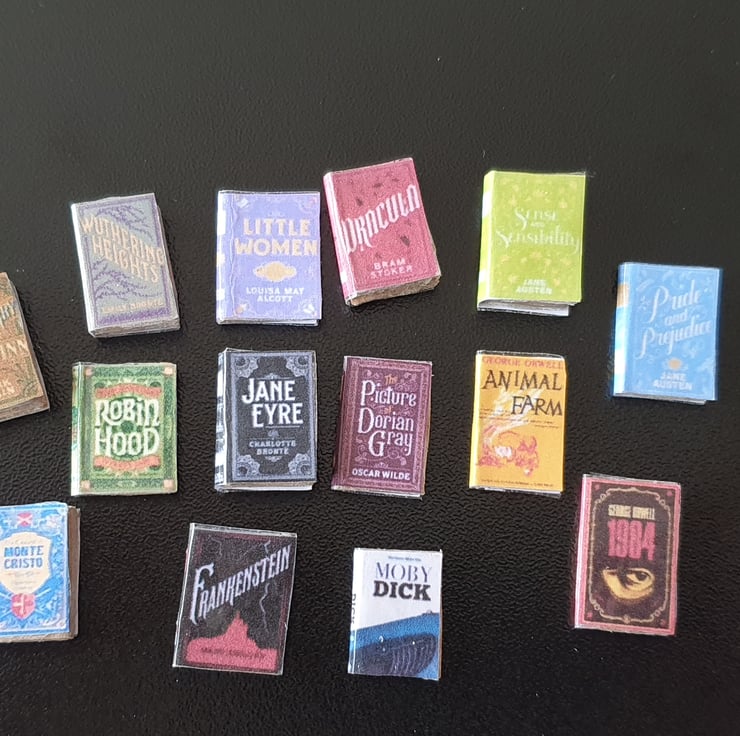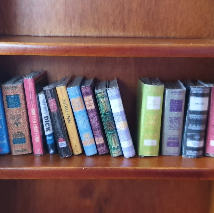 The last picture shows the books on a 1:12 scale bookcase.