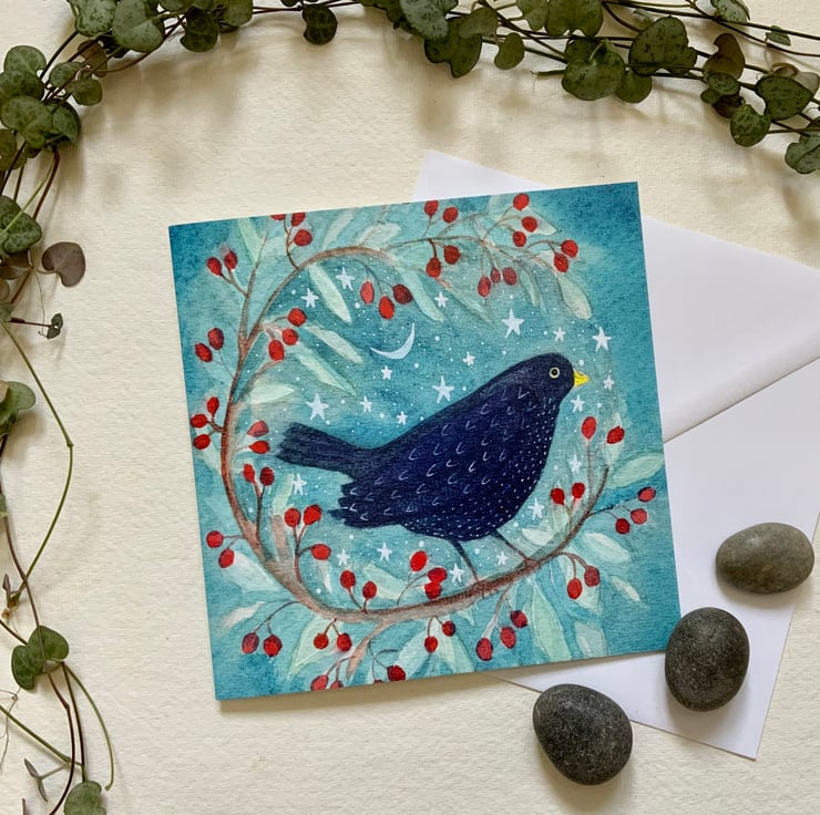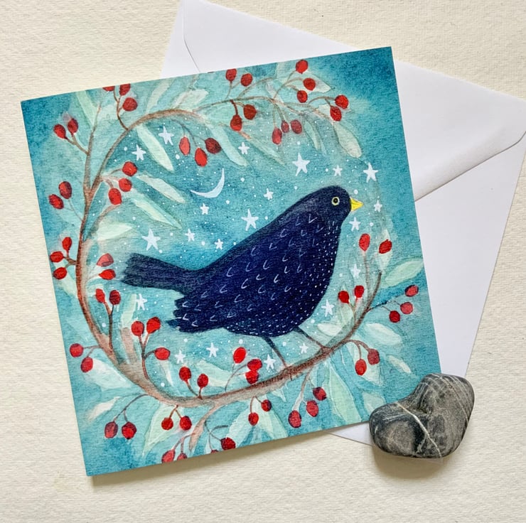 This is a card printed from one of my original paintings. It features a stylised blackbird in a wreath of berries. it measures 14.5x14.5cm and is blank inside making it suitable for a number of occasions. It comes with an envelope.