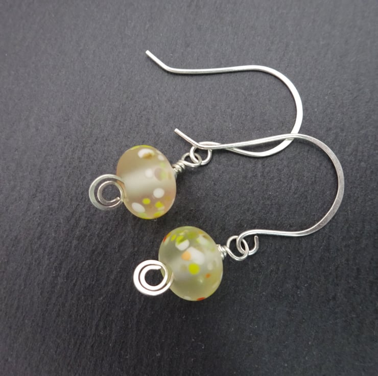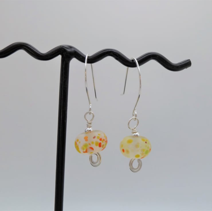 A pair of earrings made using handmade sterling silver ear wires, sterling silver beads and handmade lampwork glass beads.