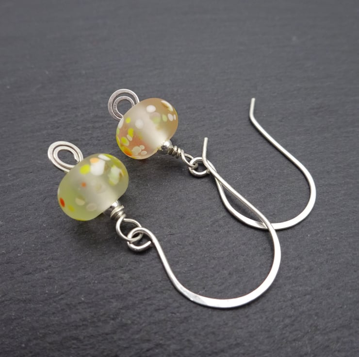 The beads have been handmade by me using clear glass with speckles of yellow, white and orange glass. They have been tumbled to give a frosted finish.
