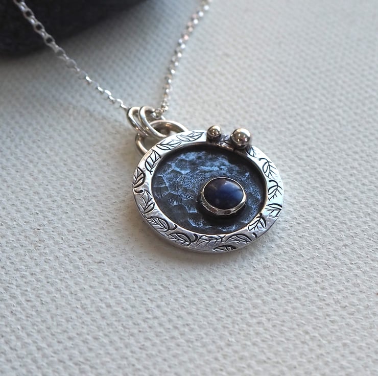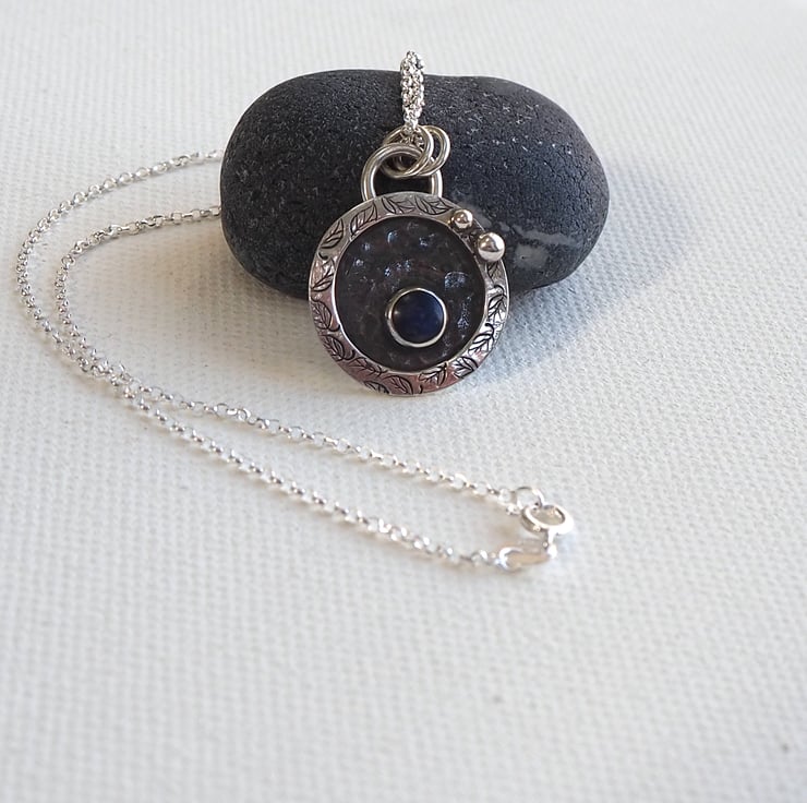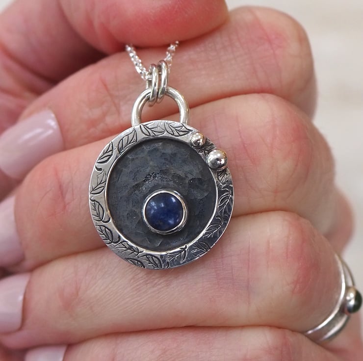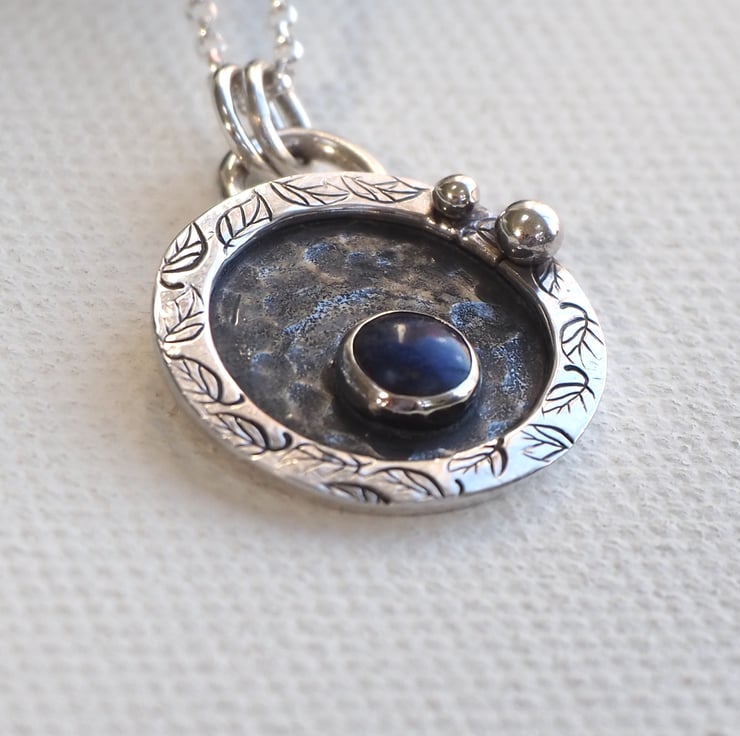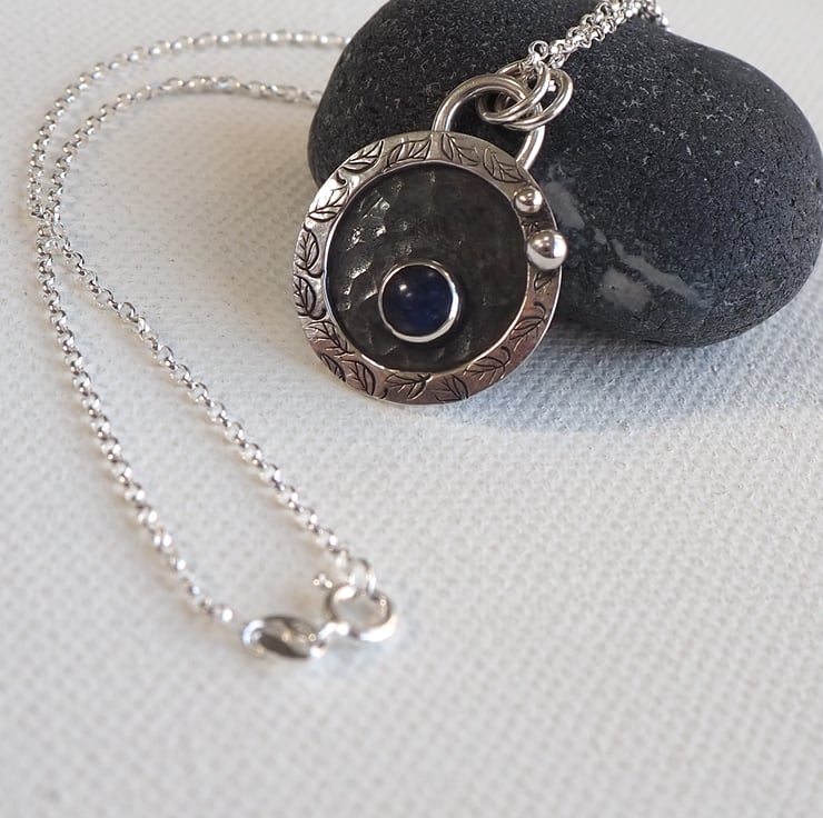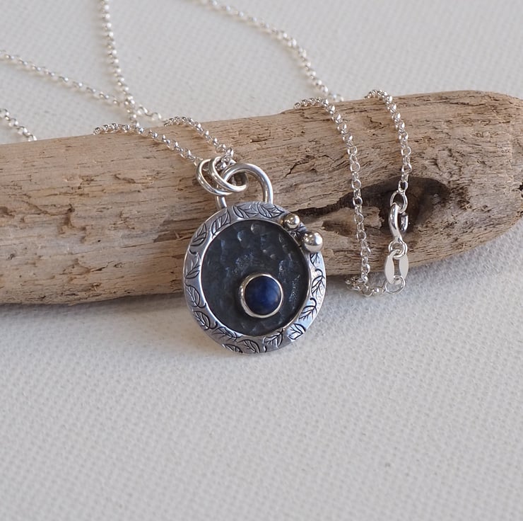 This handmade Sterling Silver 925 round pendant has a frame of leaves punched into the silver. The centre has been given a dark patina to create an aged/antinqued look. Other areas have been polished to a bright shine to add contrast. A lapis lazuli cabochon is the focal point of the pendant. This has a lovely dark inky blue colour. Two small recycled silver balls have been soldered to the frame to add further detail.