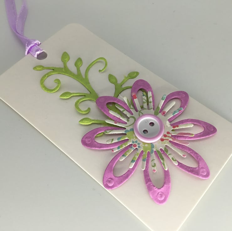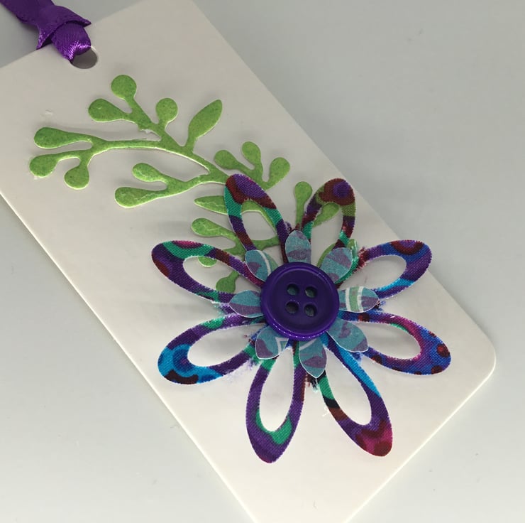 The flowers are made from a variety of pretty card, papers and one includes fabric. Each tag is unique. The flowers have been further embellished with a button in the centre.