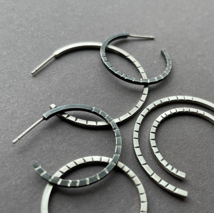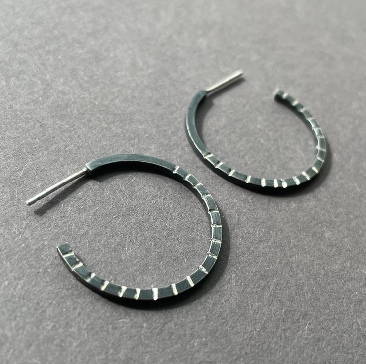 The hoops are hand made from sterling silver square wire which has been oxidised to a dark grey finish. The little lines have been filed to reveal the silver underneath. Can also be make larger, please message for details.