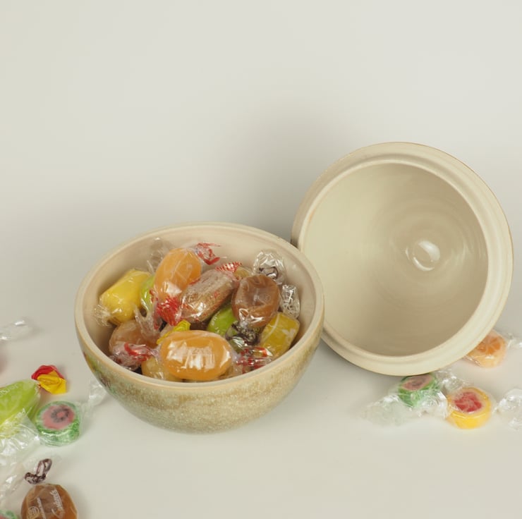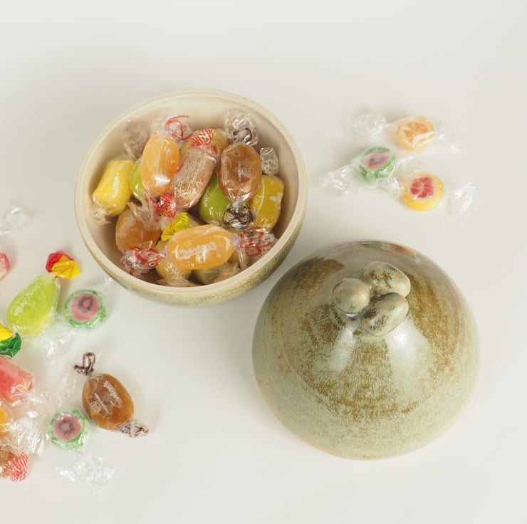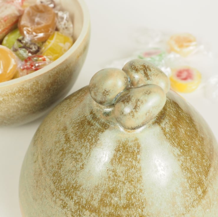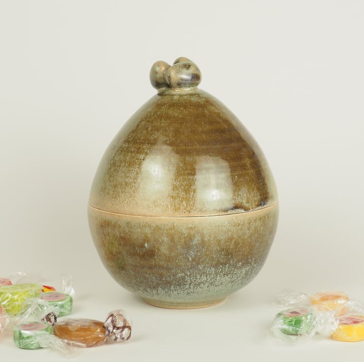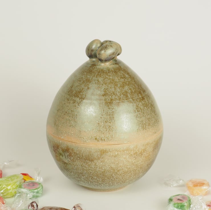 A lidded ceramic Easter Egg in a rich green glaze, decorated with a knob made of 3 small egg shapes. Lift the lid using the knob and fill with your own choice of goodies. Re-use again and again without all the unwanted packaging.