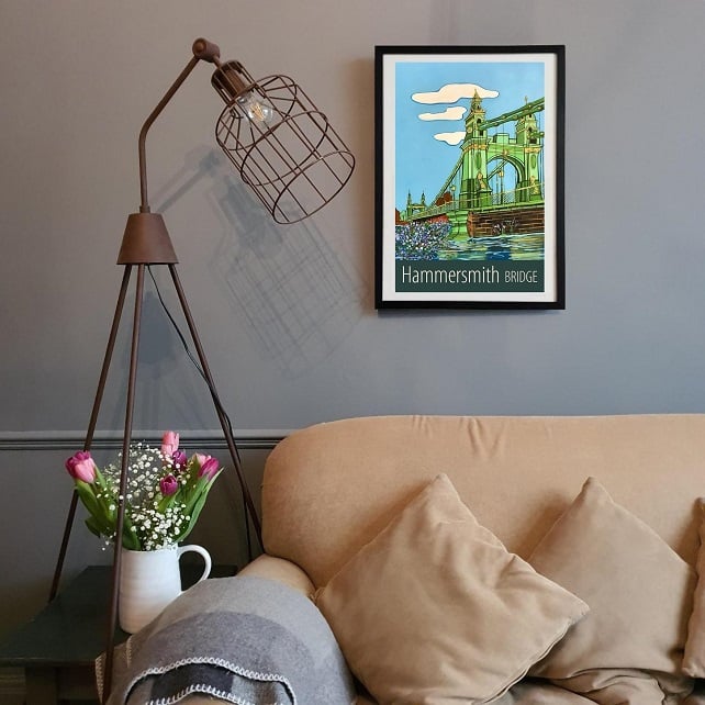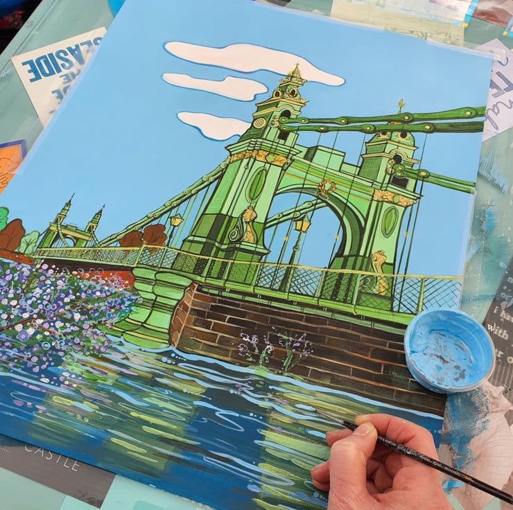 A contemporary travel poster style print of Hammersmith Bridge in London, from my own original acrylic painting.