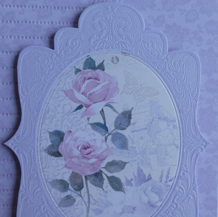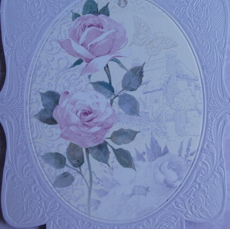 This elegant card suitable for Birthday, Get Well or just to say that you're thinking of someone has a central image showing soft pink roses in a lilac frame style surround.