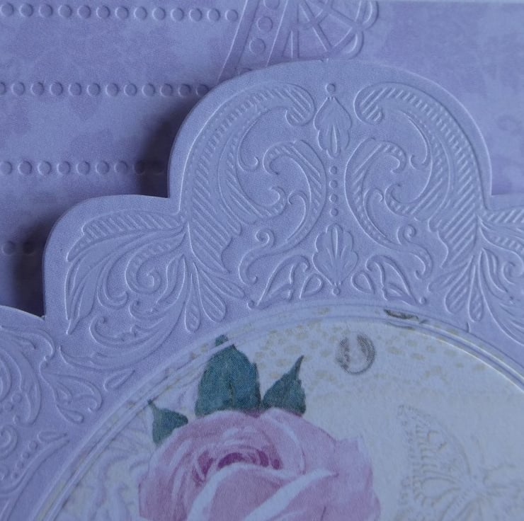 The image has been raised on foam pads above a background of lilac card which has pearlised details down the left hand side.
