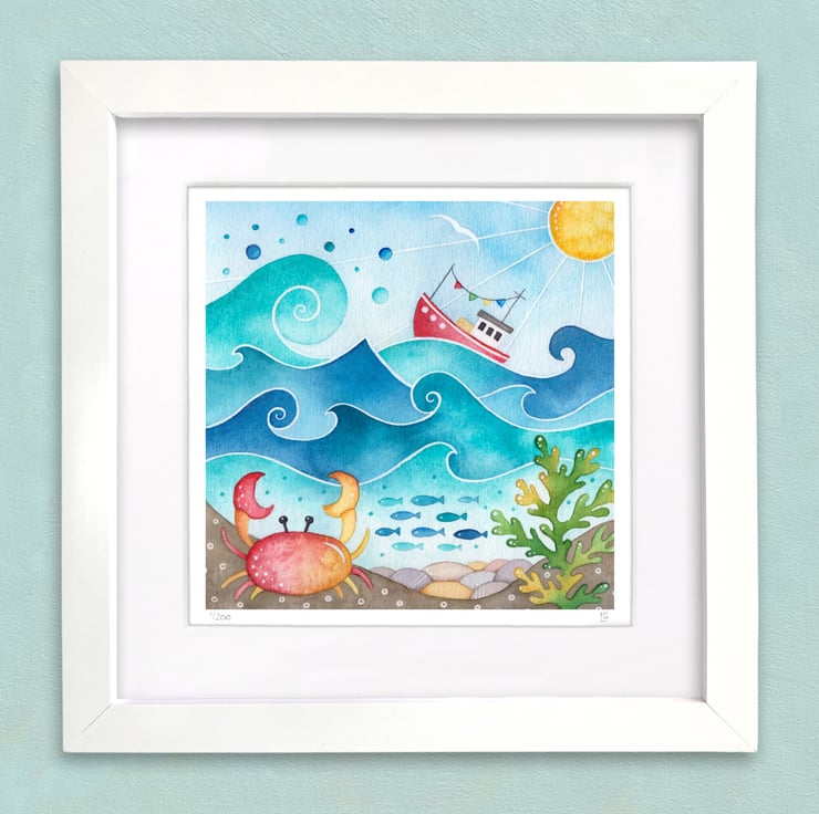 This print shows a little fishing boat bobbing along bravely on a stormy turquoise sea! Below the waves, a little crab sits on the seabed as a shoal of fish swim by. Seagulls, seaweed and a pebbly ocean floor finish off this charming seaside scene.