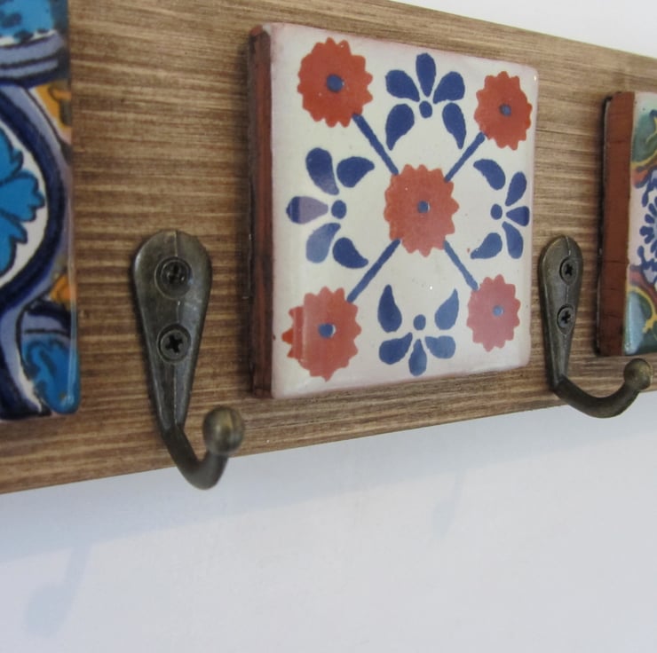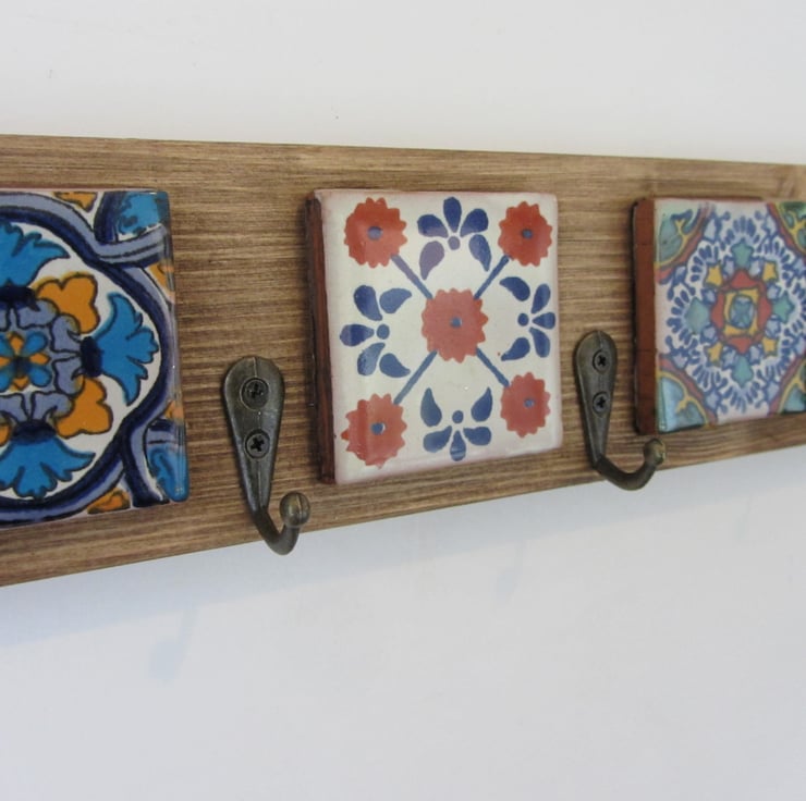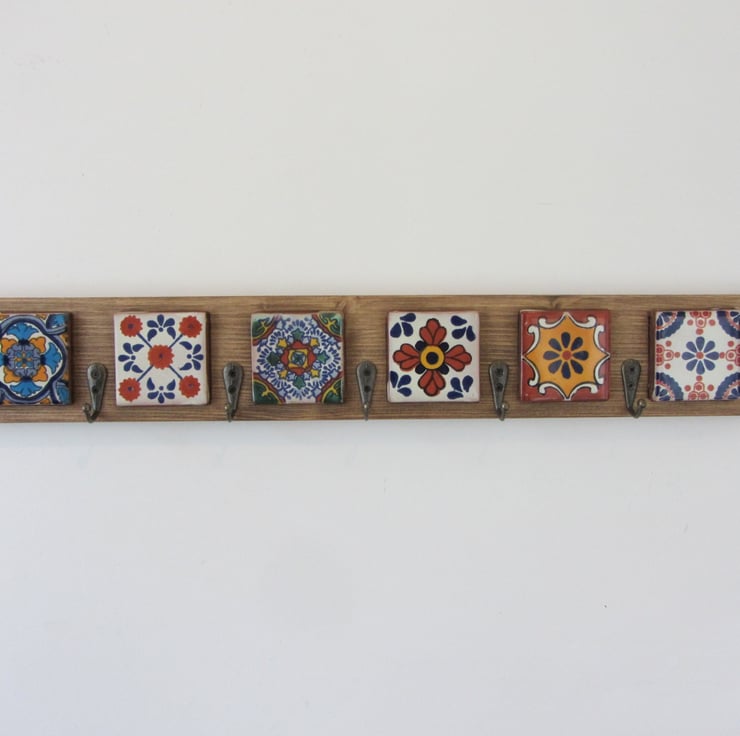 Handmade to order from reclaimed wood with genuine hand painted Mexican tiles and antique bronze metal key hooks.(tiles picked randomly)