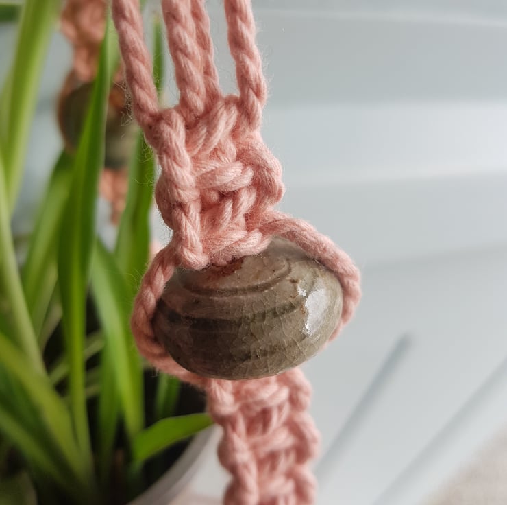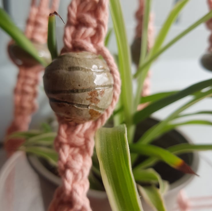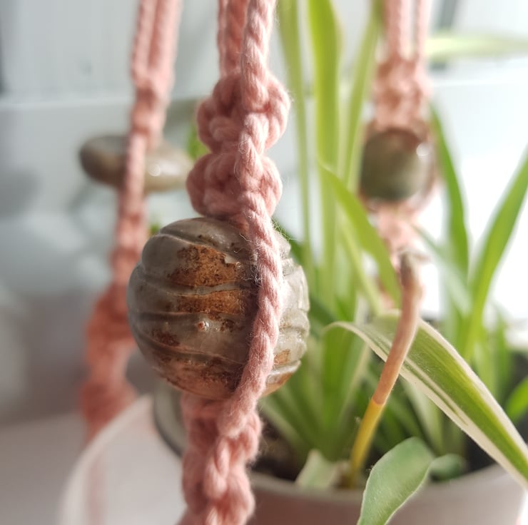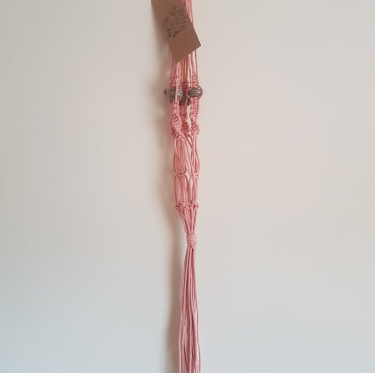 A beautiful handmade hanging basket, made using 100% pure cotton cord in dusty pink, with handmade ceramic beads and a natural wooden ring.