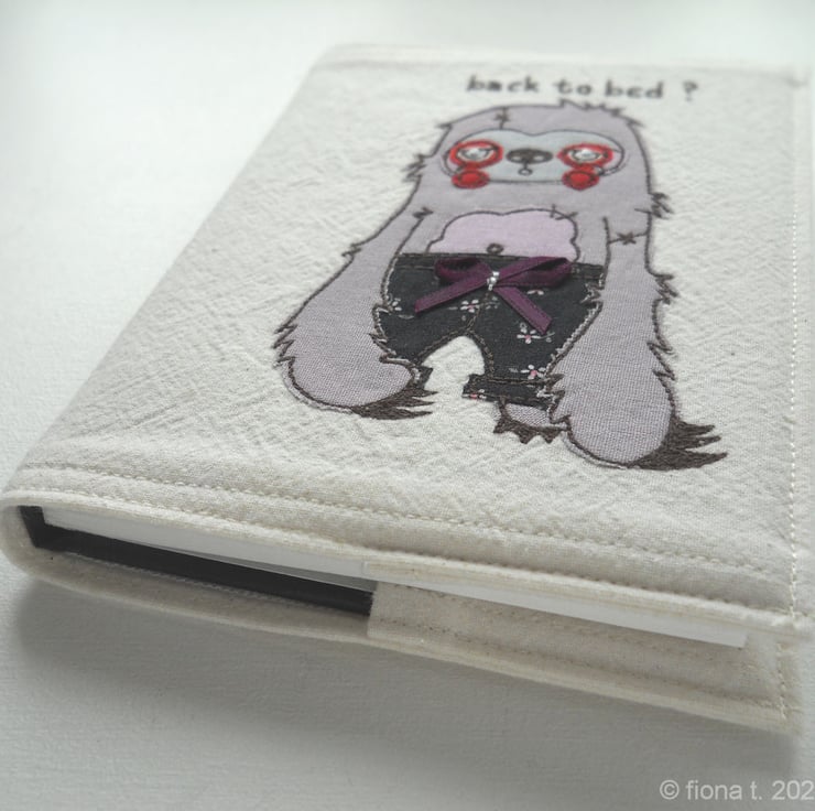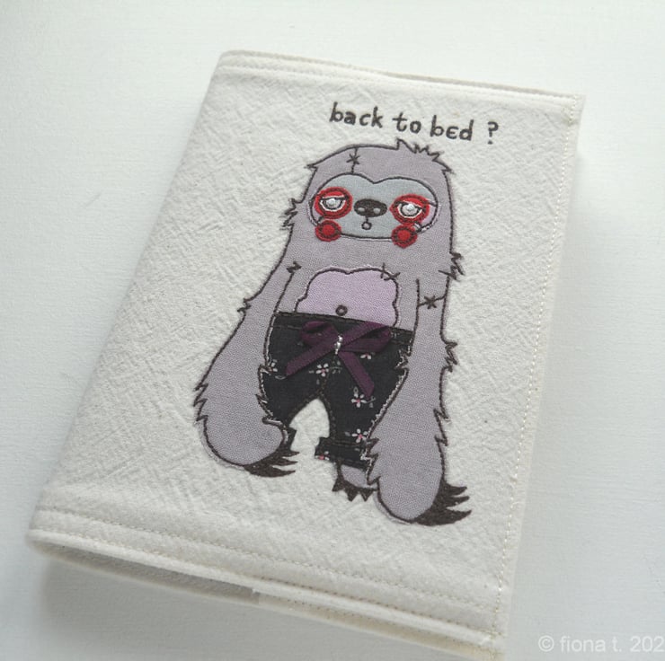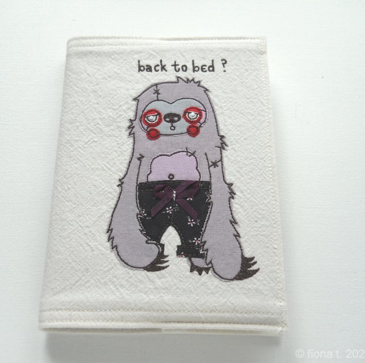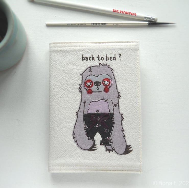 applique & freehand embroidered zombie sloth notebook cover with A6 sketchbook inside.