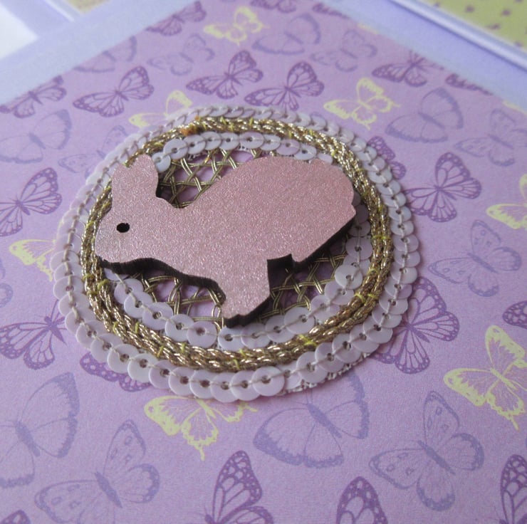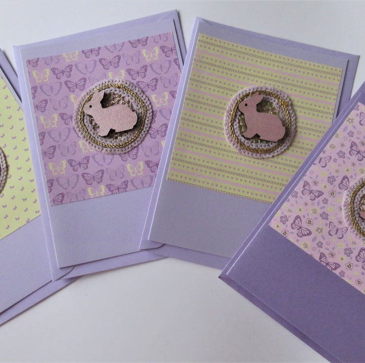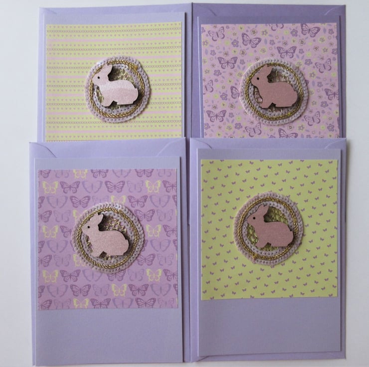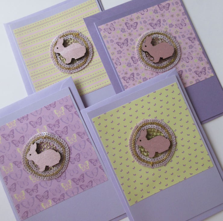 A set of 4 blank greetings cards, each featuring a hand painted wooden bunny embellishment, on top of a sequin motif.