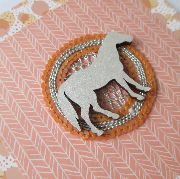 The card blank has a decorative print on it, which has been topped with co-ordinating craft paper, a sequin motif, and a hand painted wooden pony.